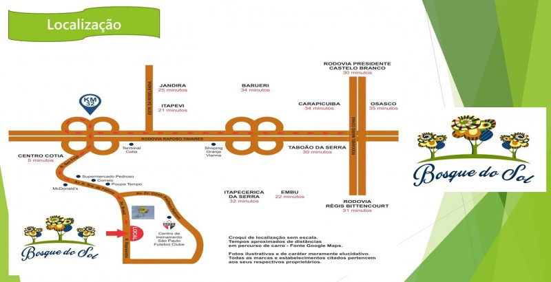 LOCALIZAÇÃO: privilegiada: acesso pela saida 32 da rod Raposo Tavares, centro de Cotia, redes bancárias, escolas, comercios em geral, menos de 5 minutos do centro de Cotia, ótimo ponto de referencia, estamos atrás do cet do São Paulo futebol clube.